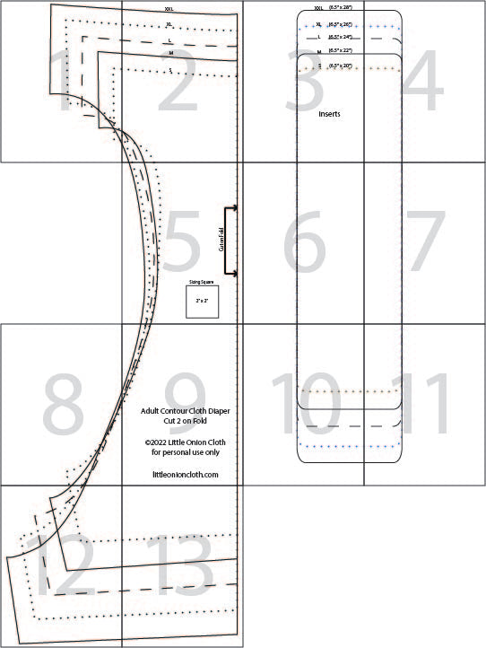 SIZE RANGE: This contour cloth diaper pattern is available in 5 sizes: S, M, L, XL, XXL.