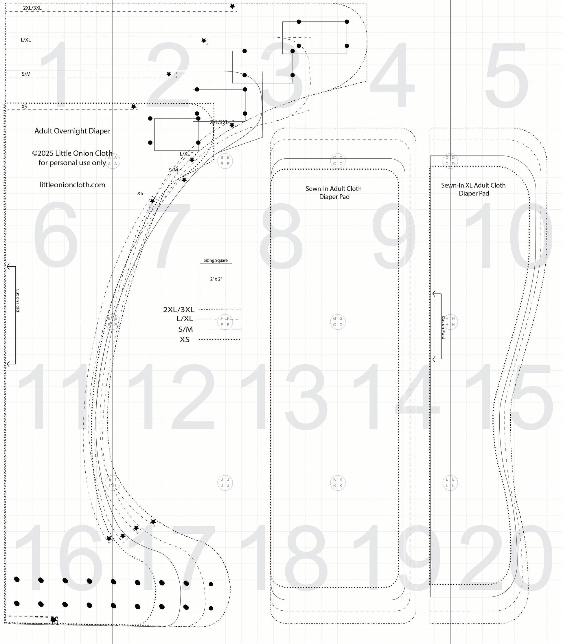 SIZE RANGE: This overnight cloth diaper pattern is available in 4 sizes: XS, S/M, L/XL, 2XL/3XL. It includes patterns for corresponding inserts as well.